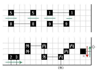 ・旗門の端は、どちらかが輪の内側、もう一方が輪の外側になる。